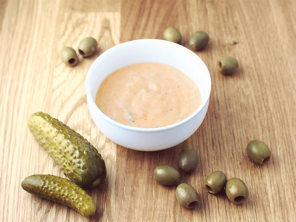 Kojarzony z daniami typu fast food, zapamiętałam jako tłustą mieszankę majonezu z ketchupem dodawaną do hot dogów, z czasów kiedy jadałam jeszcze produkty odzwierzęce. 1000 wysp w wersji wegańskiej pasuje do warzywnych burgerów, kanapek i sałatek. Podam przy okazji przepis na majonez sojowy, który najlepiej sprawdza się w tym akurat przepisie.